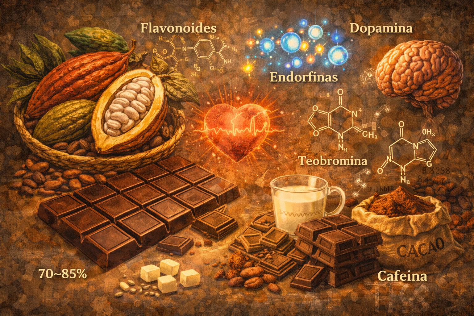 El cacao contiene flavonoides, compuestos antioxidantes con posibles beneficios cardiovasculares y cognitivos, así como teobromina, un estimulante suave que actúa sobre el sistema nervioso. También estimula la liberación de dopamina y endorfinas, asociadas al bienestar.