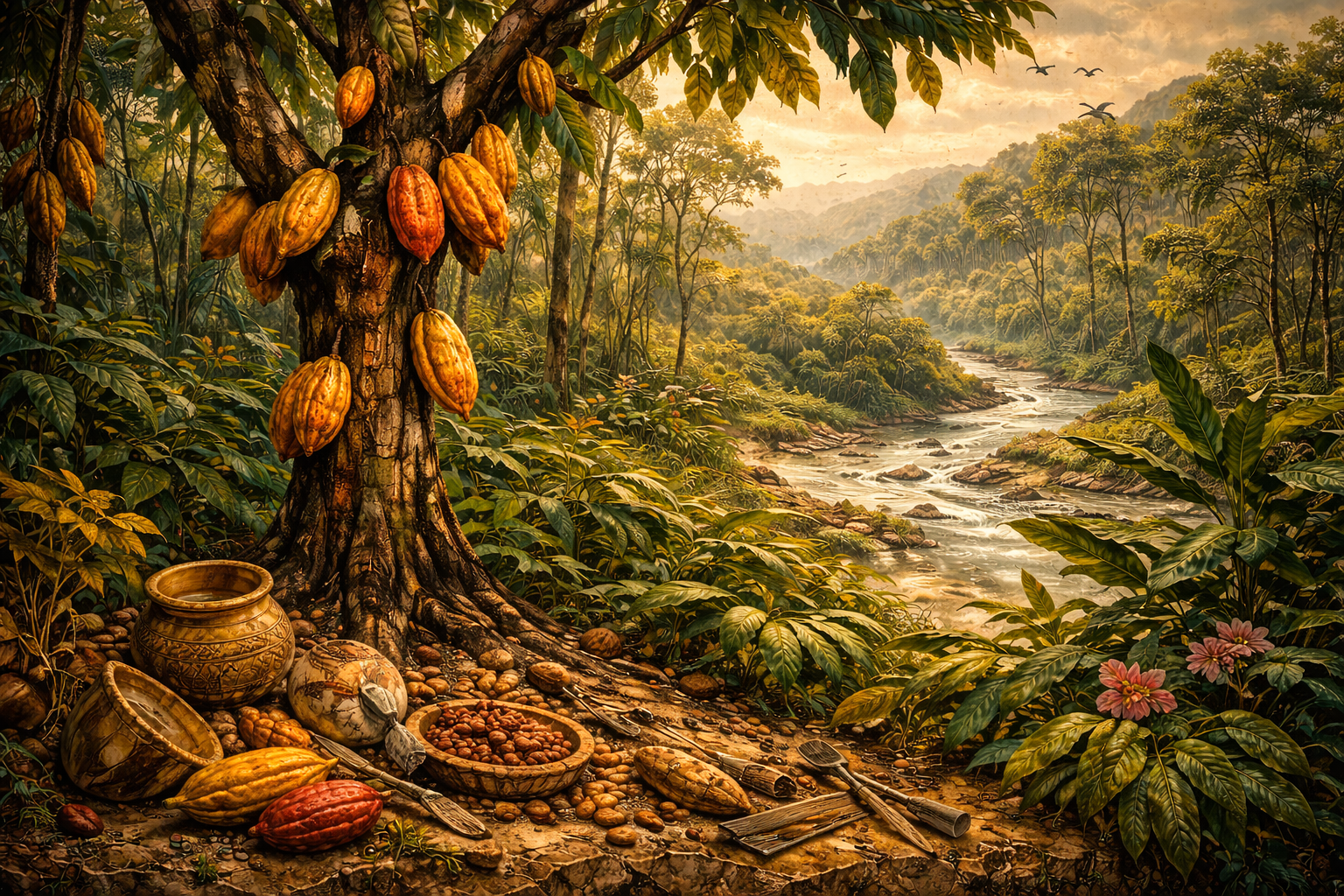 El árbol del cacao (Theobroma cacao) tuvo su origen en la selva amazónica. Evidencias arqueológicas y genéticas indican que fue domesticado hace más de 5,000 años y que posteriormente se expandió hacia Mesoamérica siguiendo la costa del Pacífico.