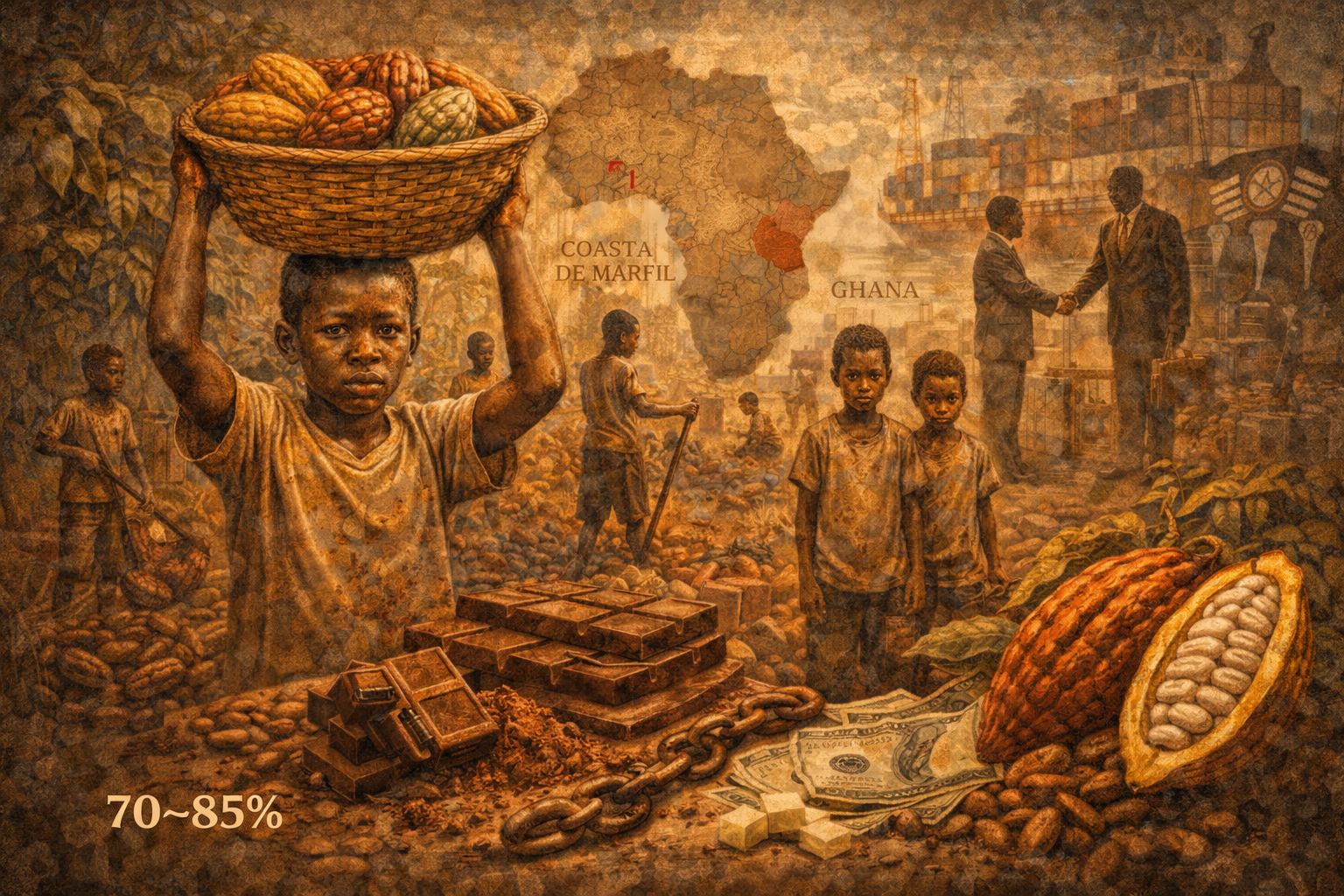 Actualmente, más del 60% del cacao mundial se produce en Costa de Marfil y Ghana, regiones donde persisten graves problemas de pobreza y trabajo infantil. Millones de niños trabajan en plantaciones en condiciones peligrosas y con salarios mínimos.